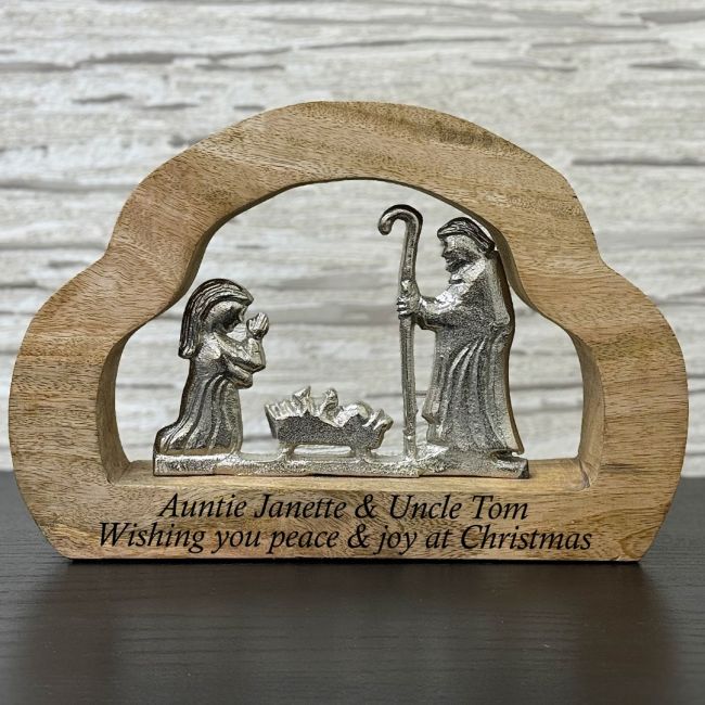 This exquisite piece not only enhances festive décor but also serves as a reminder of the true spirit of the season. The figures, meticulously crafted from metal, stand in striking contract to the wooden backdrop, capturing the essence of the nativity story. Wood & metal. Comes boxed. H20 x W29 x D5cm. Engrave up to 2 lines, 40 characters per line.
