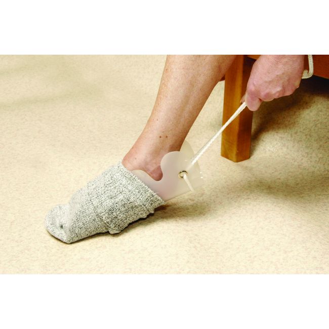 The unique shape of the flexible sock aid keeps socks on the aid until the sock is pulled all the way onto the foot. The pliable trough is easy to bend and can be bent into any shape. The loop handle measures 91cm long. Requires the use of two hands. Plastic.